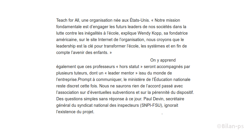 - Teach For France : La formation des enseignants confiée en douce au privé – source 1 – source 2 – capture