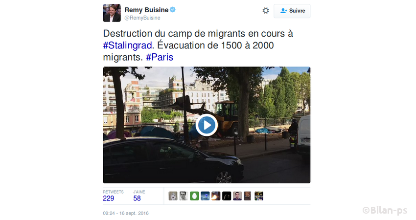 - Paris, évacuation de 1500 migrants et destruction des tentes au bulldozer – source – capture – vidéo