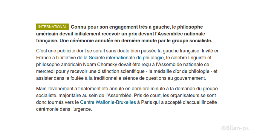 - Le groupe socialiste annule la réception de Noam Chomsky à l’Assemblée – source – capture