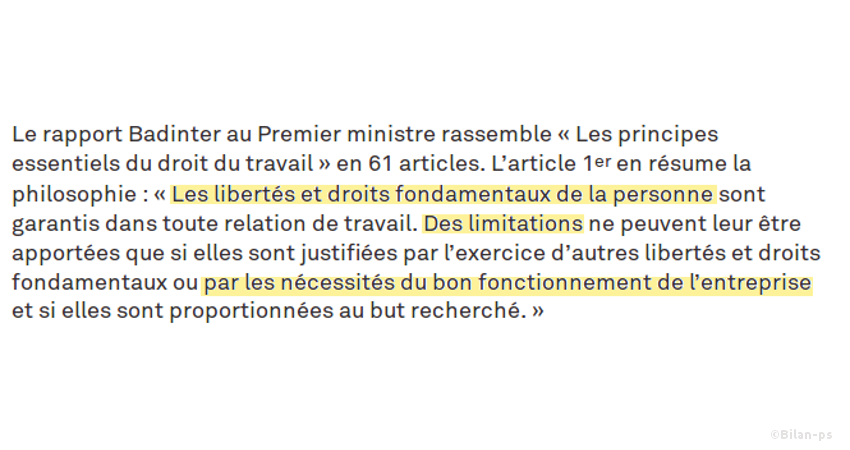 - Rapport Badinter : Des limitations peuvent être apportées aux libertés et droits fondamentaux si elles sont justifiées par les nécessités du bon fonctionnement de l’entreprise. – source – capture