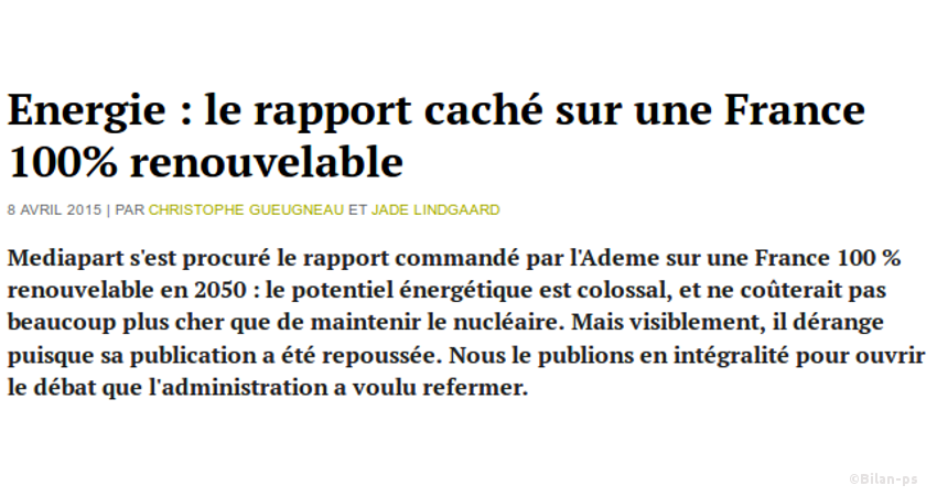 - Ajournement du rapport de l’ADEME – pdf sur une France 100% renouvelable – source – capture