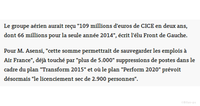 - Air France : 100 millions d’€ de CICE en 2 ans = 5500 emplois supprimés – source – capture – Juniac